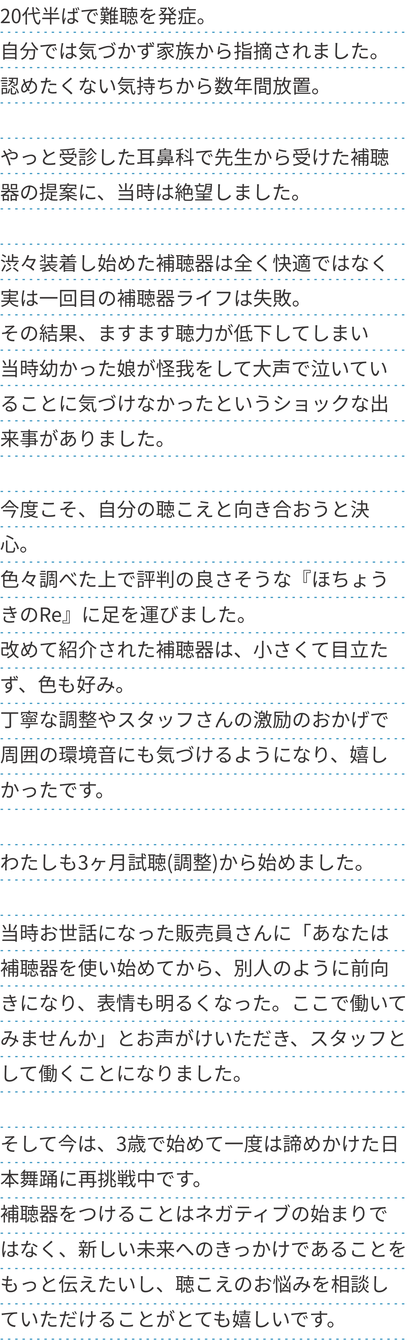 補聴器をつけることはネガティブの始まりではなく、新しい未来へのきっかけであることをもっと伝えたいし、聴こえのお悩みを相談していただけることがとても嬉しいです。